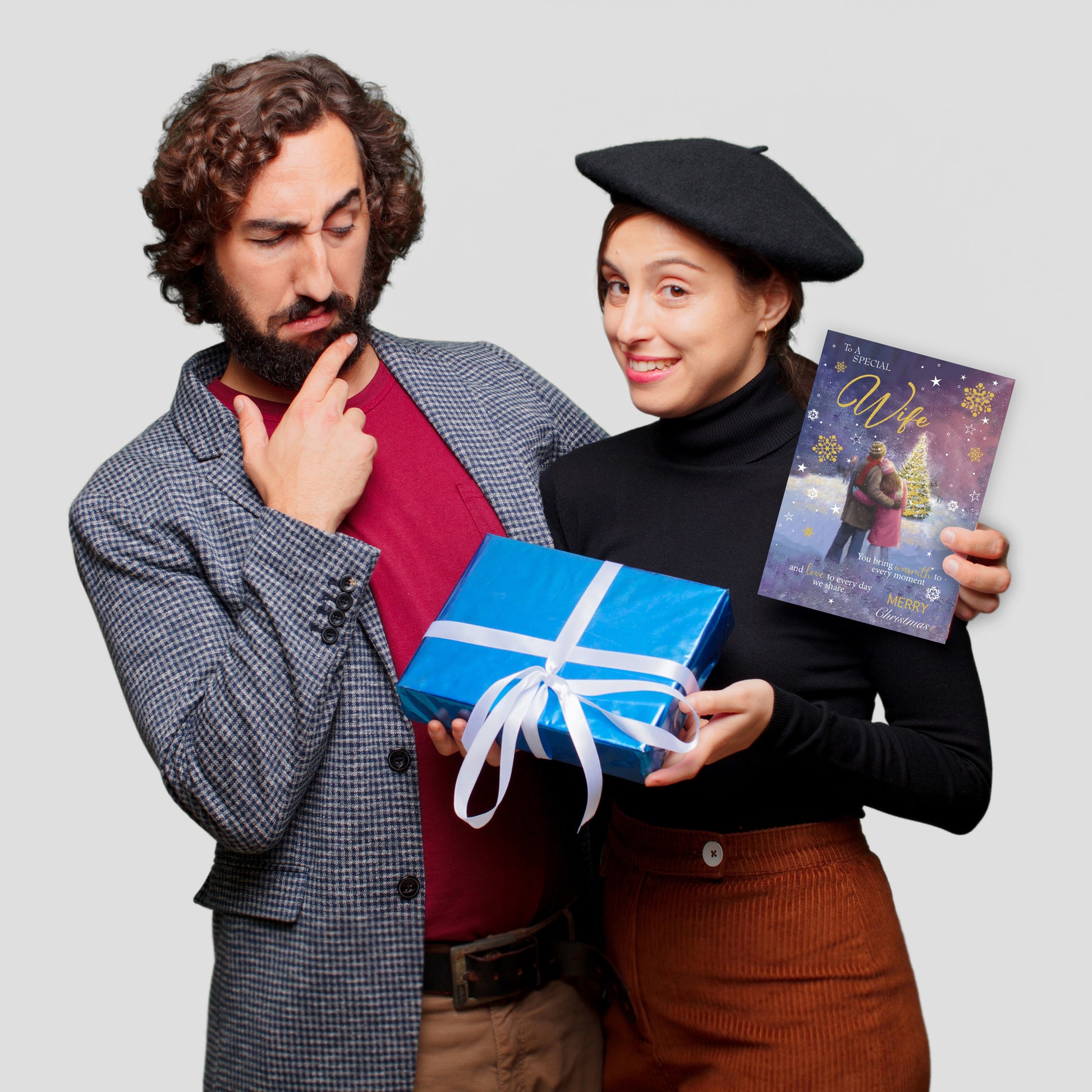 - ✔ WIFE CHRISTMAS CARD 2024: Beautiful winter scene featuring a couple embracing in the snow, with a glowing Christmas tree, snowflakes, and gold accents for a magical festive feel.